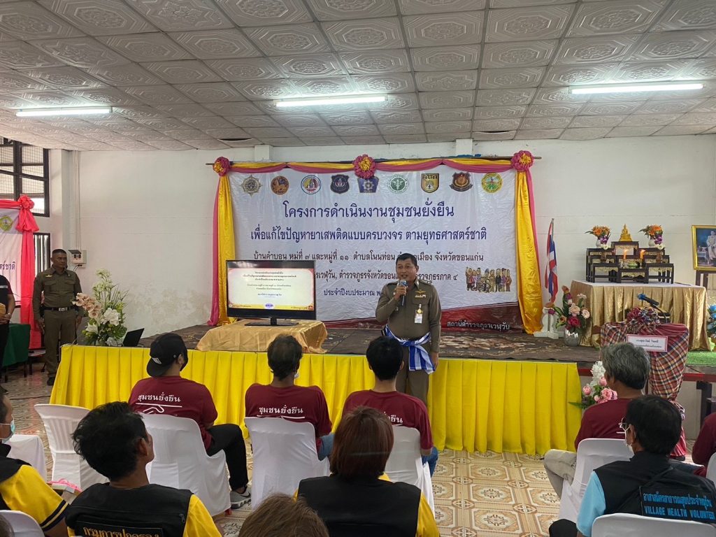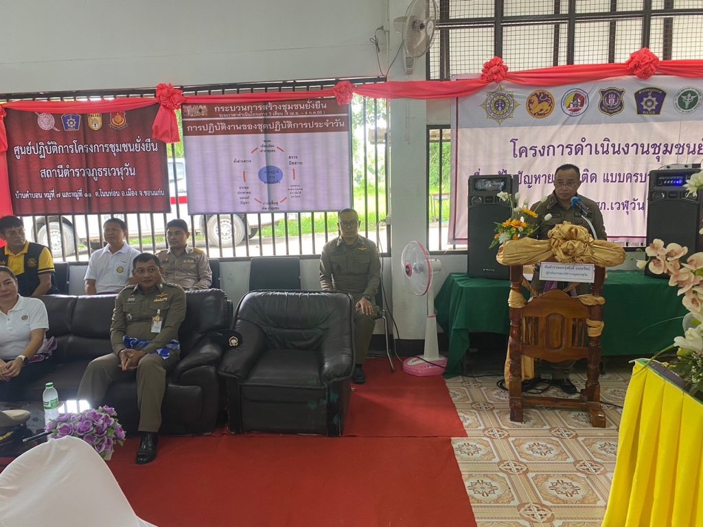 พ.ต.อ.ธีระวัฒน์ นุมานิต รอง ผบก.ภ.จว.ขอนแก่น, พ.ต.อ.รุ่งศักดิ์ จงกลรัตน์ ผกก.สภ.เวฬุวัน พร้อมด้วย พ.ต.ท.พีระพัทธ์ เทพบรรหาร รอง ผกก.ป.ฯ ,พ.ต.ท.สมชาย สิงห์เสนา สว.อก.ฯ , พ.ต.ต.สุนทร จันโท สวป.ฯ ,พ.ต.ต.วุฒิศักดิ์ ดีสวน สว.สส.ฯ ,ชุดปฏิบัติการชุมชนยั่งยืน และเจ้าหน้าที่ตำรวจ สภ.เวฬุวัน ได้ร่วมพิธีปิดโครงการชุมชนยั่งยืนเพื่อแก้ไขปัญหายาเสพติดแบบครบวงจรตามยุทธศาสตร์ชาติ ประจำปีงบประมาณ 2566 โดยมี นางสุธาวัลย์ ริมผดี นายกเทศมนตรีตำบลโนนท่อน เป็นประธานในพิธี