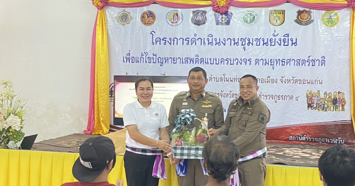 พ.ต.อ.ธีระวัฒน์ นุมานิต รอง ผบก.ภ.จว.ขอนแก่น, พ.ต.อ.รุ่งศักดิ์ จงกลรัตน์ ผกก.สภ.เวฬุวัน พร้อมด้วย พ.ต.ท.พีระพัทธ์ เทพบรรหาร รอง ผกก.ป.ฯ ,พ.ต.ท.สมชาย สิงห์เสนา สว.อก.ฯ , พ.ต.ต.สุนทร จันโท สวป.ฯ ,พ.ต.ต.วุฒิศักดิ์ ดีสวน สว.สส.ฯ ,ชุดปฏิบัติการชุมชนยั่งยืน และเจ้าหน้าที่ตำรวจ สภ.เวฬุวัน ได้ร่วมพิธีปิดโครงการชุมชนยั่งยืนเพื่อแก้ไขปัญหายาเสพติดแบบครบวงจรตามยุทธศาสตร์ชาติ ประจำปีงบประมาณ 2566 โดยมี นางสุธาวัลย์ ริมผดี นายกเทศมนตรีตำบลโนนท่อน เป็นประธานในพิธี